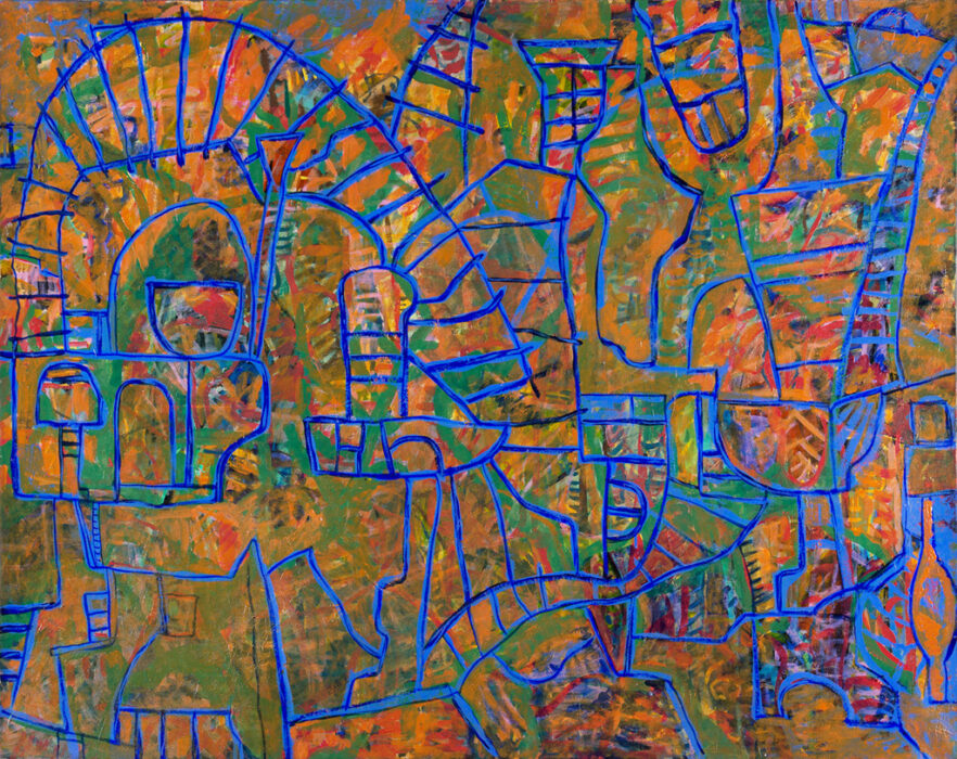 In Himmelfarb’s work, matrices of anxious line are more robust, sometimes pressed into service of bold expressionism that threaten to obscure the forms they describe. Among his ongoing series of truck images are the Puerto Vallarta paintings. Earlier examples consist of bright, two-color images inspired by an auto-driver’s eye view of the backs of semis and other rigs. The stylized patterns of lines gave the pieces an appealing graphic quality. Newer works from that series are denser and more painterly, as in Puerto Vallarta No. 89, with color palette more fiery and foreboding. The change in temperament may be interpreted as an attitude change about the vicissitudes of traffic. But for Himmelfarb it is just as likely to represent another turn in the leveraging of the simple motif into a vehicle for changing formal exploration.