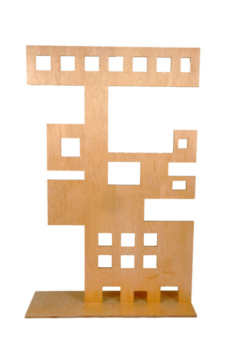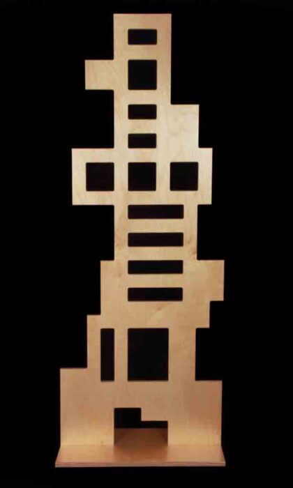 Just as some of Himmelfarb’s recent paintings demonstrate a return to a more formal simplicity, his new Icon sculptures are yet more restrained. These thin standing sculptures, made of powder coated steel or veneered plywood appear as totems built of graphic blocks or pixels—in a way, archetypes of a modern communication. They are the spiritual heirs to his prior works involving an invented vocabulary of symbols and hieroglyphs, out of which the truck motif originally arose. With titles like Architect, Leader and Local Hero, the sculptures aspire to be portraits, or at least frameworks for describing aspirational citizens.