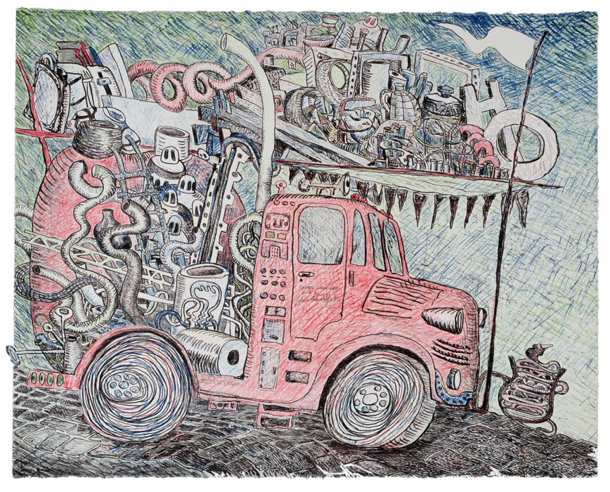 According to RoGallery.com, Himmelfarb “has occasionally incorporated truck imagery in his work, usually in an ancillary role, or as a single character in larger, more complicated pieces. In more recent years, he has been using the image of a truck as the central organizing principle in his paintings, drawings, prints, and now in sculpture.”