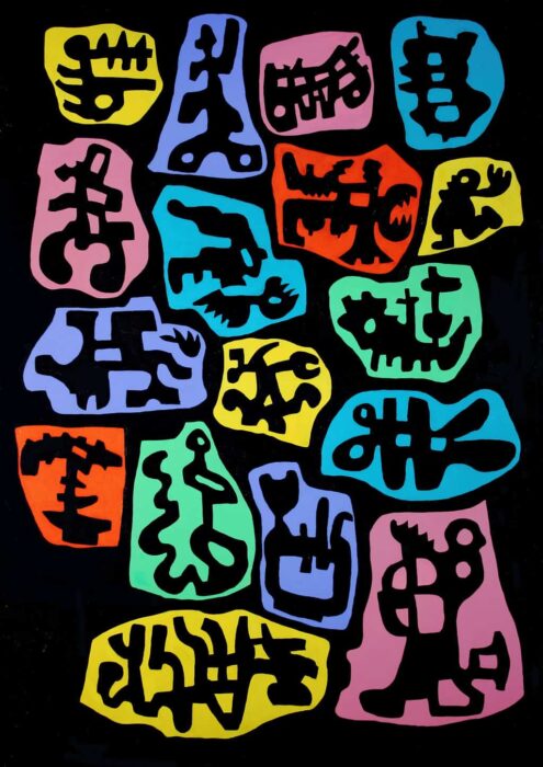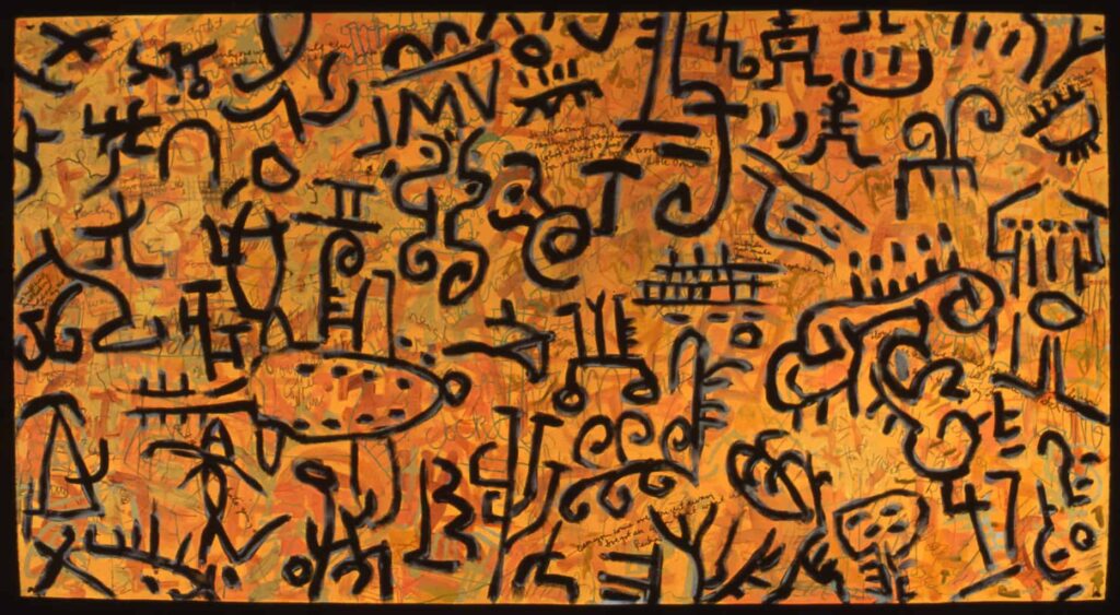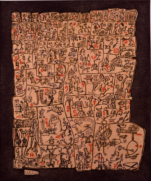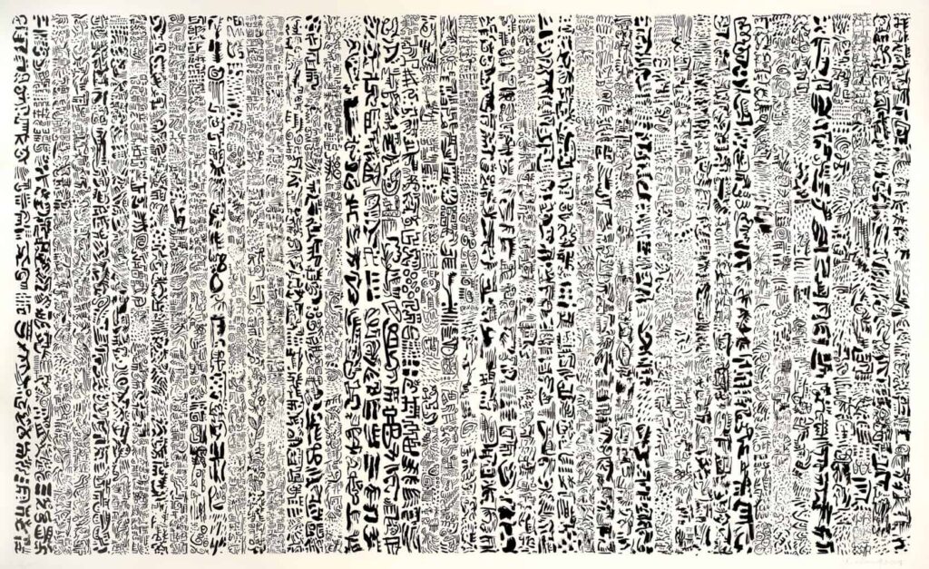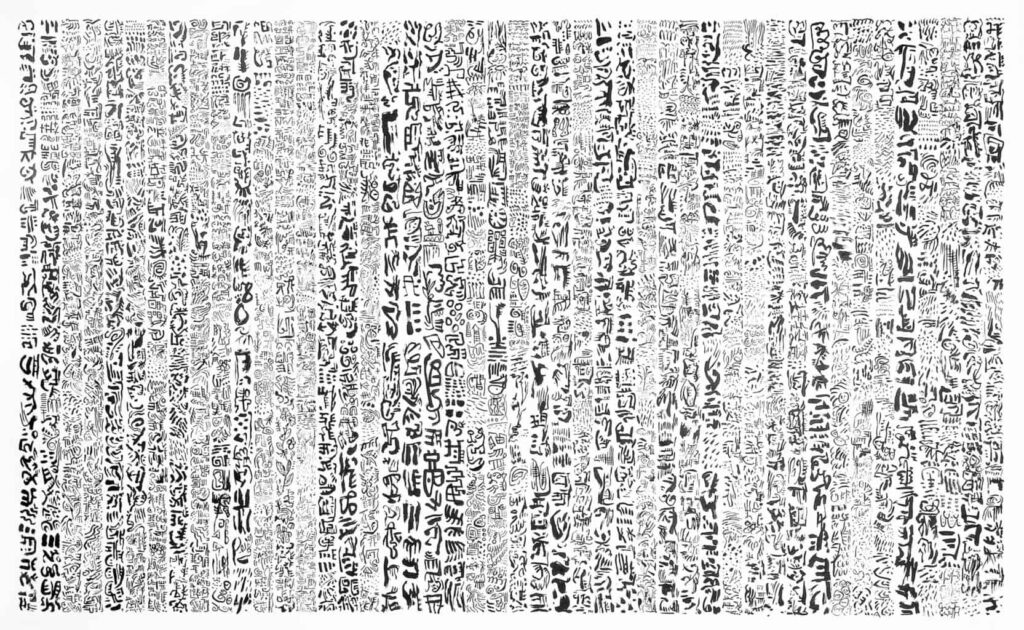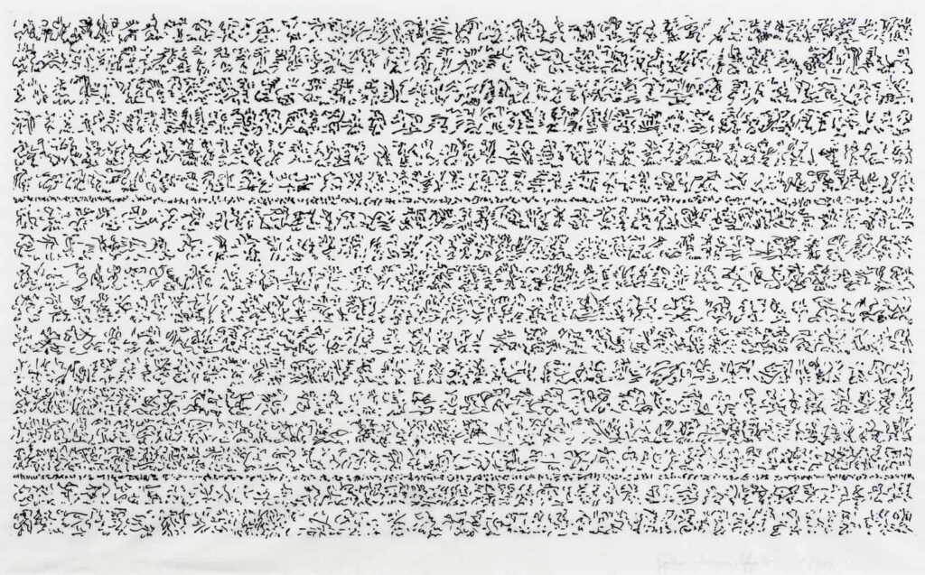 Many of the works are large but composed of myriad small images. They resemble cuneiform writing in some cases, and in others, they are comic strips of pulsing meaning or even avant garde wallpaper designs.