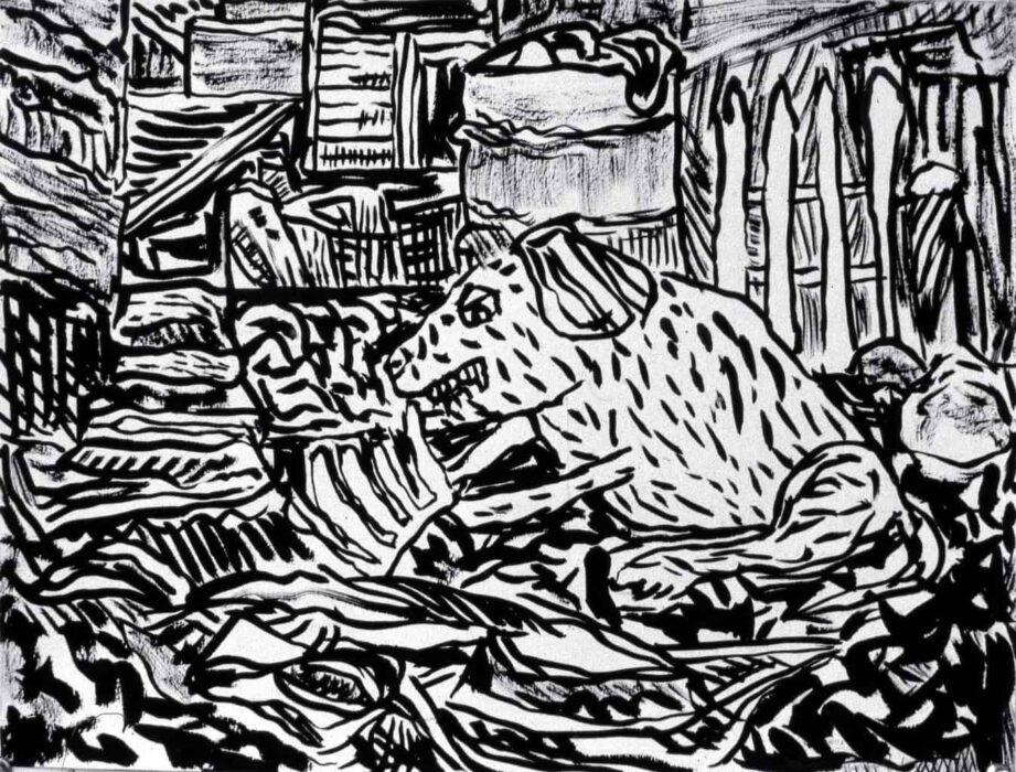 The images are humans, sharp-toothed beasts, fierce-beaked birds, industrial objects, over-loaded arks, all in a steamy surging tangle that speaks of the complexity of life.
