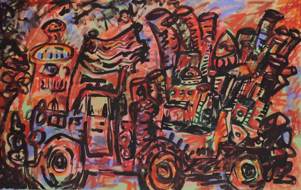 Typical Himmelfarb images reflect the modern world’s machinery, cars, buildings and furniture. His little people, often nude, run, play and watch television, all with frenetic action. Both drawings and paintings are virtually inexhaustible, since the viewer’s eye keeps on inventing new images.